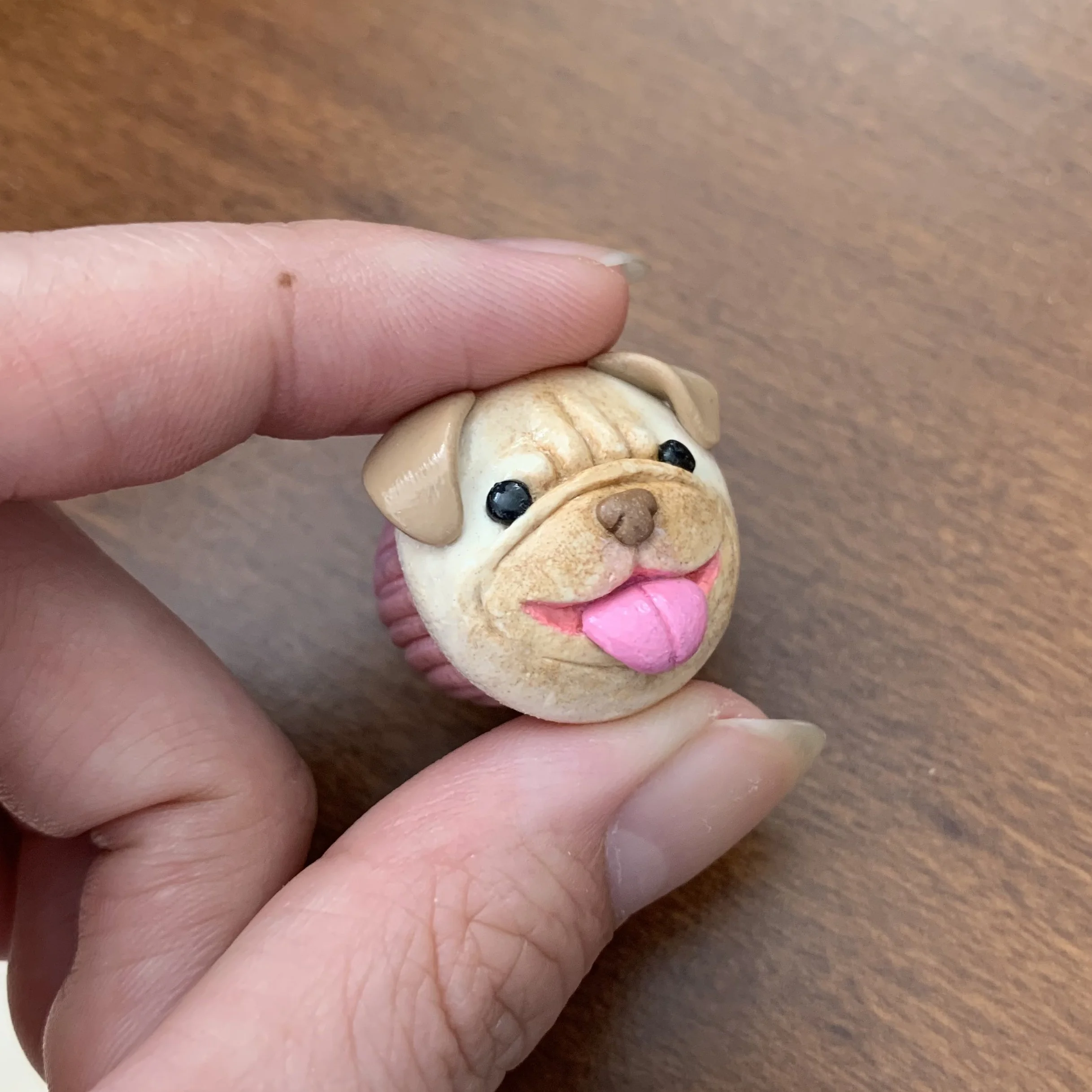 Polymer clay miniature of a friend’s dog Muffin, as a muffin